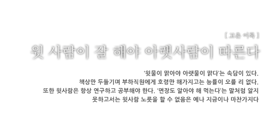 ‘윗물이 맑아야 아랫물이 맑다’는 속담이 있다. 책상만 두들기며 부하직원에게 호령만 해가지고는 능률이 오를 리 없다. 또한 윗사람은 항상 연구하고 공부해야 한다. ‘면장도 알아야 해 먹는다’는 말처럼 알지 못하고서는 윗사람 노릇을 할 수 없음은 예나 지금이나 마찬가지다.